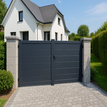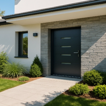 La porte en aluminium est fabriquée à partir d’un cadre robuste et léger, souvent renforcé par une rupture de pont thermique qui évite les déperditions de chaleur. Les panneaux peuvent être pleins, vitrés ou semi-vitrés, avec un vitrage sécurisé. L’alu se distingue par sa durabilité exceptionnelle : il ne rouille pas et ne se déforme pas. Côté esthétique, l’aluminium offre une infinité de finitions (mat, satiné, texturé) et de coloris, idéal pour les maisons modernes.
