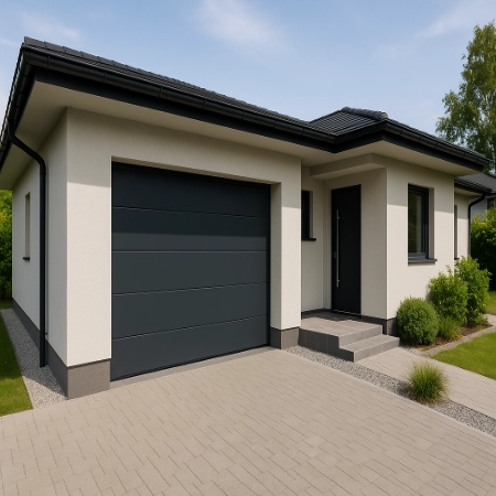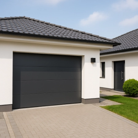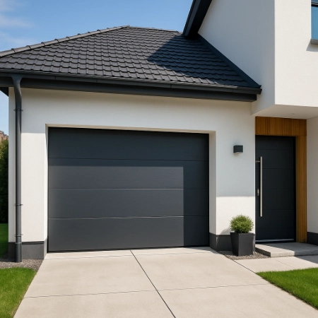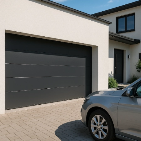 Très répandue, la porte sectionnelle s’ouvre verticalement et se loge sous le plafond du garage. Elle est idéale pour optimiser l’espace et permet une excellente isolation thermique. Motorisée, elle offre un confort d’utilisation au quotidien.